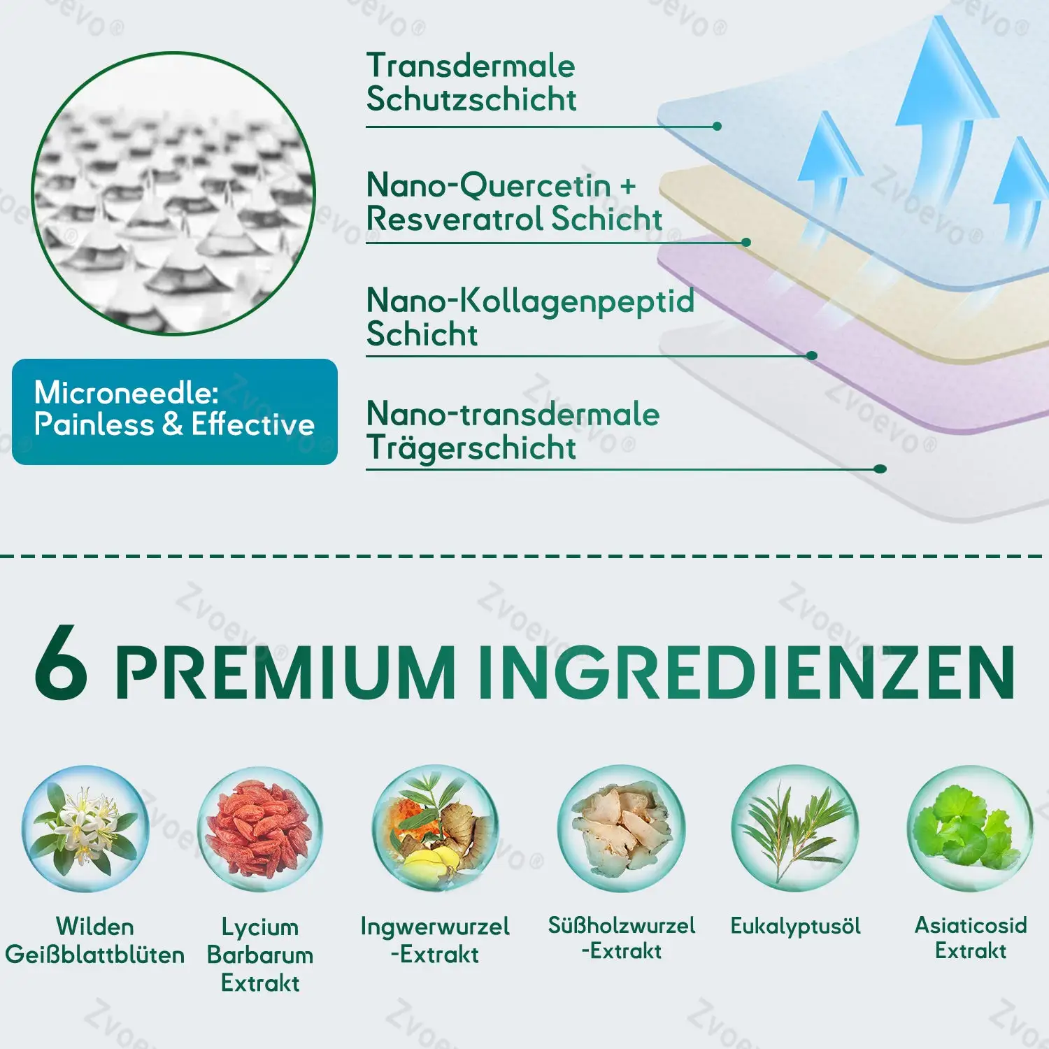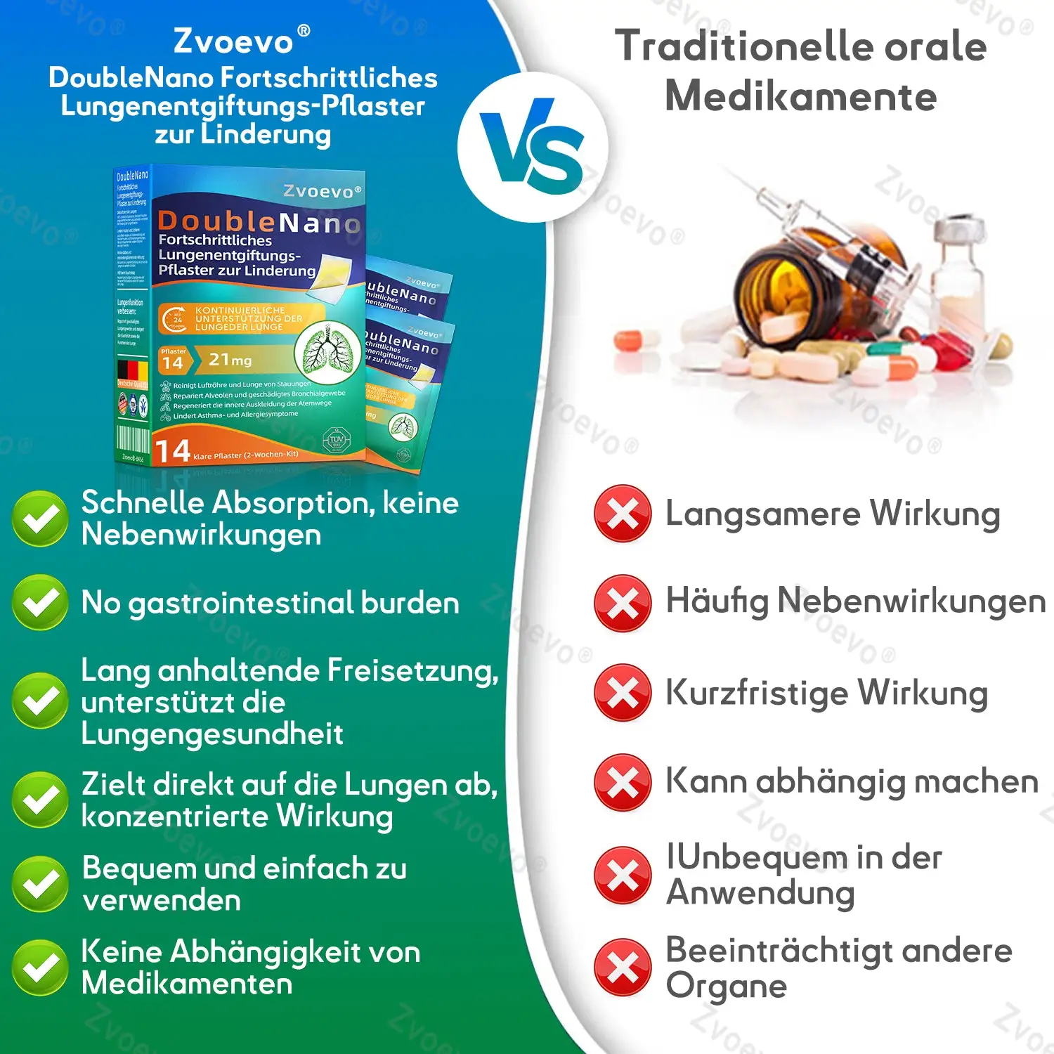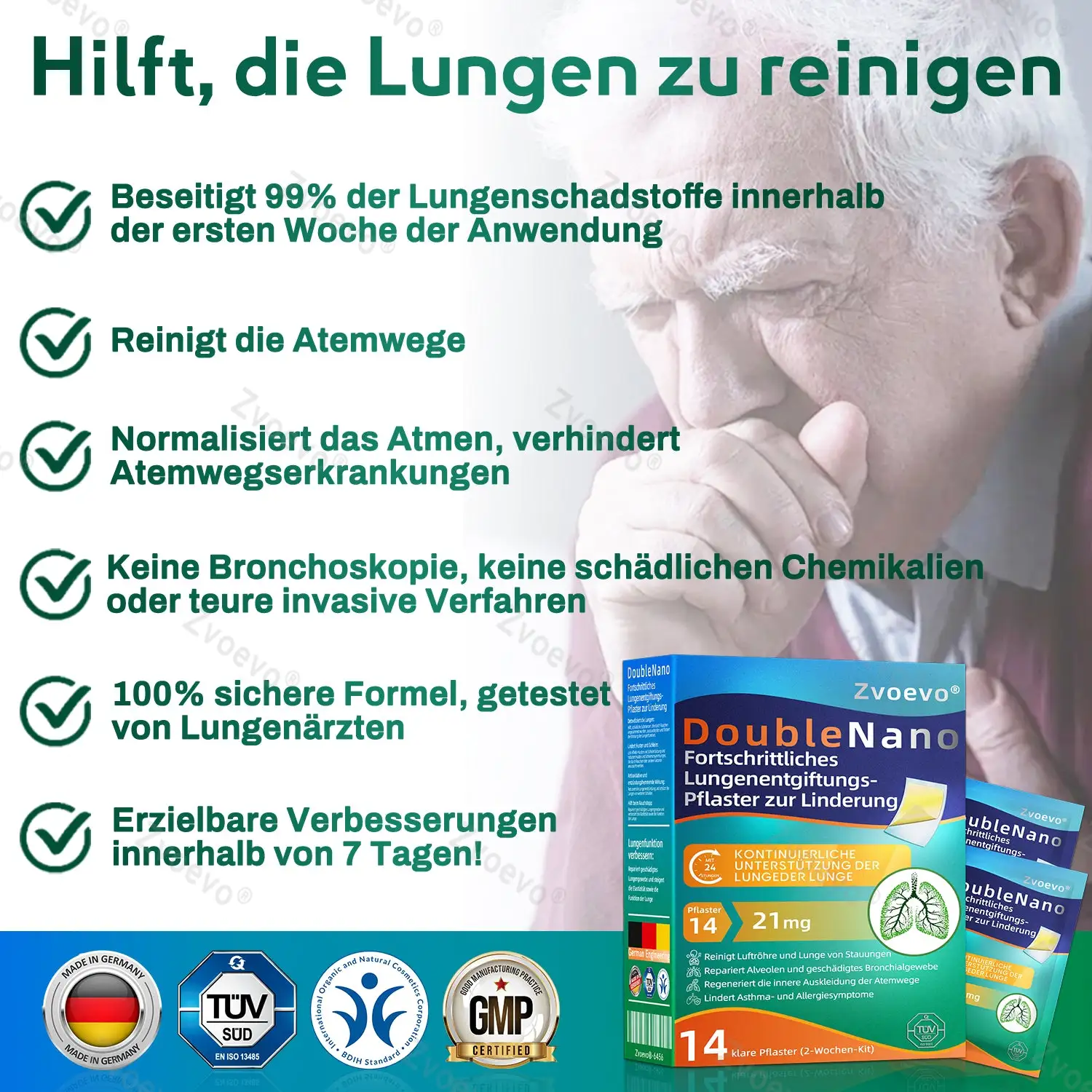 Die einzigartige Doppel-Nano-Formel aus Nano-Quercetin + Resveratrol und Nano-Kollagenpeptiden im Nano-Lungenreinigungspflaster bietet starke antioxidative und immunstรคrkende Vorteile. Diese Wirkstoffe bilden eine Schutzschicht in den Atemwegen und der Lunge und unterstรผtzen die Reparatur geschรคdigter Zellen. Bei regelmรครiger Anwendung stรคrken sie die Widerstandskraft des Atmungssystems, reduzieren die Auswirkungen รคuรerer Krankheitserreger, beugen Atemwegsinfektionen vor und fรถrdern die allgemeine Lungengesundheit.