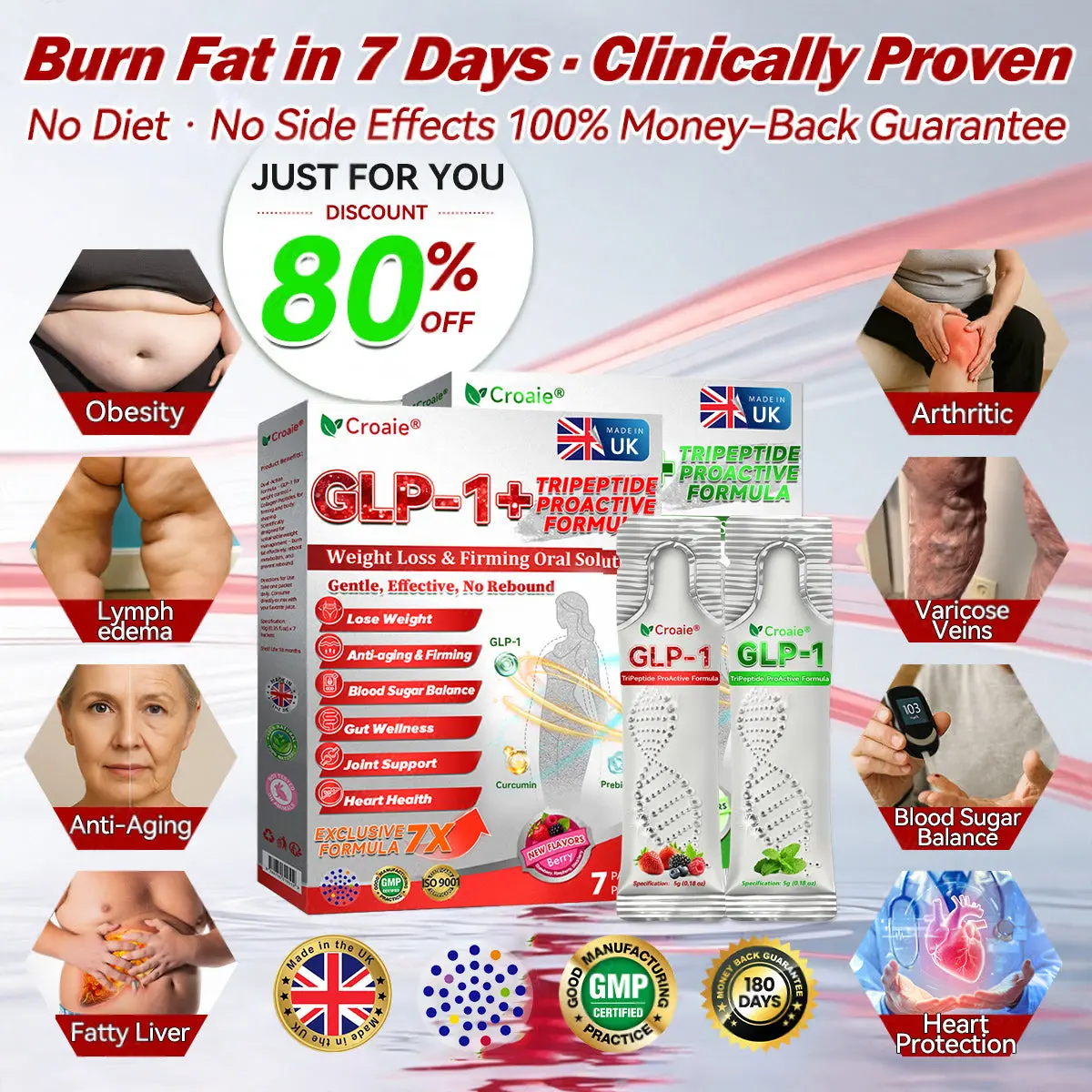 โ ๏ธ WARNING: This is the ONLY official MHRA store. All products are protected by the UK patents. Any counterfeit sales will be subject to legal action.CroaieยฎGLP-1+Collagen Peptides Weight Loss&Firming Oral Solution Developed by an international team of metabolic and endocrinology experts, the GLP-1 + Collagen Peptides Oral Solution represents a groundbreaking synergy in weight management and skin regeneration.GLP-1 technology precisely targets the bodyโs metabolic center to regulate appetite, accelerate fat breakdown, and restore energy balance. Meanwhile, Collagen Peptides work deep within the dermis to repair structural loss caused by fat reduction, rebuilding the skinโs support network and visibly improving firmness and elasticity.Clinical studies demonstrate that this dual-action formula delivers measurable resultsโreducing body fat while enhancing skin tightness within a short period of use. It offers a scientifically validated solution for sustainable health, firmness, and long-lasting vitality.