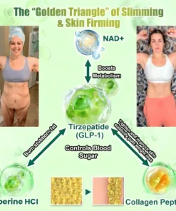 Collagen Peptides strengthen skin structure, reduce fine lines, and improve elasticity. NAD+/NMN stimulate cellular repair and collagen synthesis, while Omega-3 locks in moisture and improves skin smoothness. Green Tea Extract and Turmeric protect skin from oxidative stress and inflammation, slowing visible aging. Magnesium supports skin repair and hydration balance, while Silymarin provides detoxifying effects that brighten complexion. This synergistic formula helps lift sagging skin, smooth wrinkles, and restore a youthful glow after weight loss.