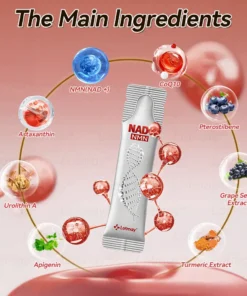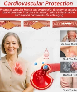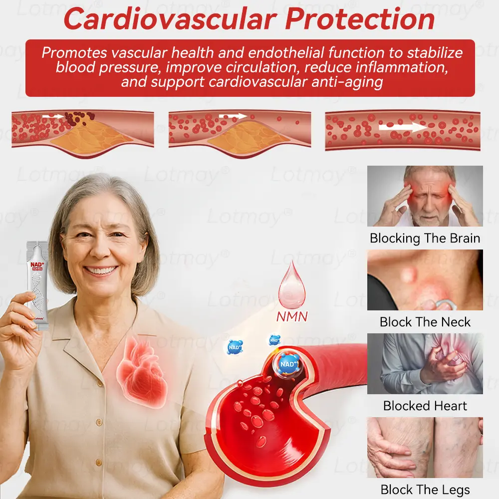 NMN (Nicotinamide Mononucleotide) converts to NADโบ, improving vascular endothelial function, enhancing cellular energy supply, helping stabilize blood pressure, and boosting vascular elasticityโthereby reducing the risk of atherosclerosis and blockages at their source. CoQ10 (Coenzyme Q10) strengthens myocardial energy metabolism, protects cardiac function, reduces oxidative damage, and promotes healthy circulation. Their synergistic action stabilizes blood pressure, improves circulation, and reduces inflammatory responses, effectively preventing blood flow blockages in the brain, neck, heart, and lower limbs. Long-term use enhances cardiovascular and cerebrovascular function, delays vascular aging, and provides more stable oxygen and nutrient delivery throughout the body.