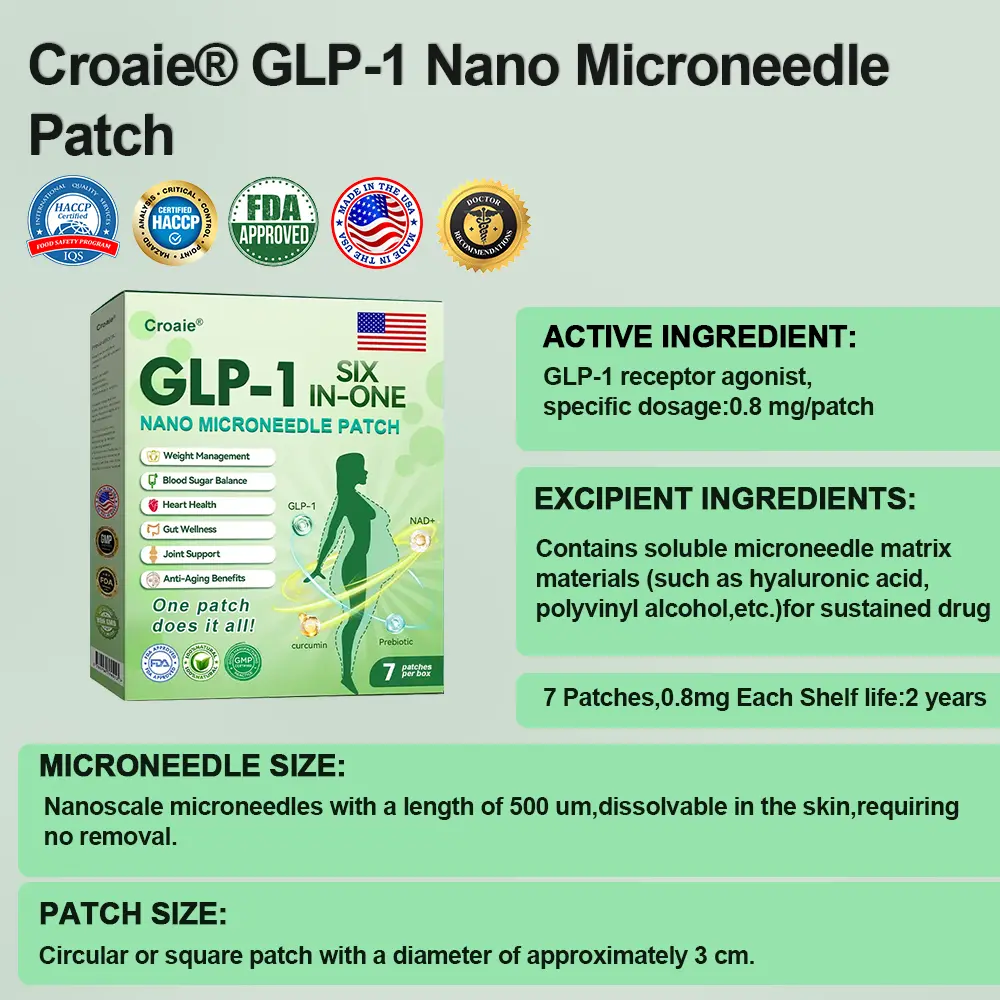 The Croaieยฎ SIX IN-ONE NIDDK-Tirzepatide Health NANO MICRONEEDLE PATCH offers a long-lasting. slow release of the medication. ensuring a stable effect over 24 hours without causing any discomfort. With the same dosage and price. it can maintain up to 20 times longer-lasting effects (similar to the difference between an IV drip and a single injection).