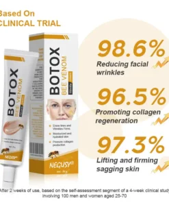 NEGUSY® Botox Bee Venom Wrinkle Removal Cream uses high-quality ingredients to maximize efficacy by locking in moisture, stimulating collagen production, smoothing wrinkles, and repairing damage.