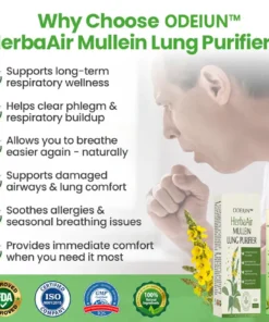“With emphysema for ten years, every morning was a struggle with tight chest and constant mucus. Mullein teas helped a little, but ODEIUN™ HerbaAir nasal inhalation gave me immediate soothing relief from the very first use. Within two weeks, I could walk my dog again without stopping.” — Karen S., Age 68, ⭐⭐⭐⭐⭐