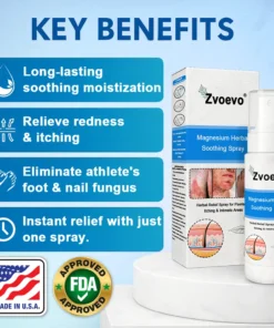 Zvoevo® Natural Magnesium Herbal Psoriasis Spray has been clinically tested and is recognized under the skincare standards of the U.S. FOOD & DRUG ADMINISTRATION. It is specifically formulated to relieve a wide range of stubborn skin conditions.