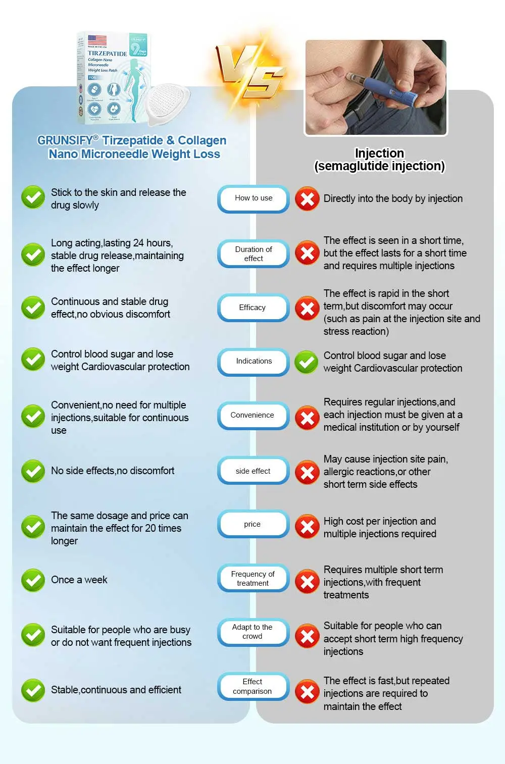 The Grunsify ® SMGT-GLP-1 Nano Microneedle Slim & Firm Patch offers a long-lasting. slow release of the active ingredients. ensuring a stable effect over 24 hours without causing any discomfort. With the same dosage and price. it can maintain up to 20 times longer-lasting effects (similar to the difference between an IV drip and a single injection).
